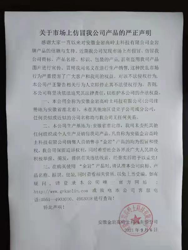 二、本公司生產(chǎn)基地為:安徽省淮北市,我司未委托其他任何組織或個人生產(chǎn)及銷售我司產(chǎn)品。凡自稱為安徽金巖高嶺土科技有限公司銷售人員銷售非“金巖”產(chǎn)品的均為假冒和侵權,我公司保留追訴權利,同時希望社會各界及廣大人民群眾積極舉報、揭發(fā),提供有關違法線索,經(jīng)查實后將予以重獎!